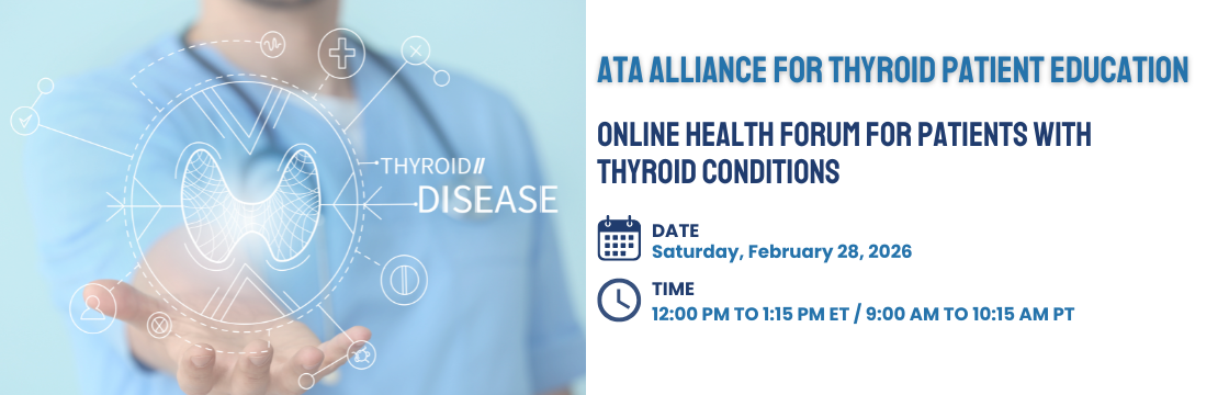 Join the ATA Alliance for Thyroid Patient Education in this Virtual Patient Forum. Our team of physician volunteers will meet with you, in a virtual group setting, to answer questions related to your journey as a patient with a thyroid related issue. Click here to reserve your spot: Virtual Patient Forum Registration.